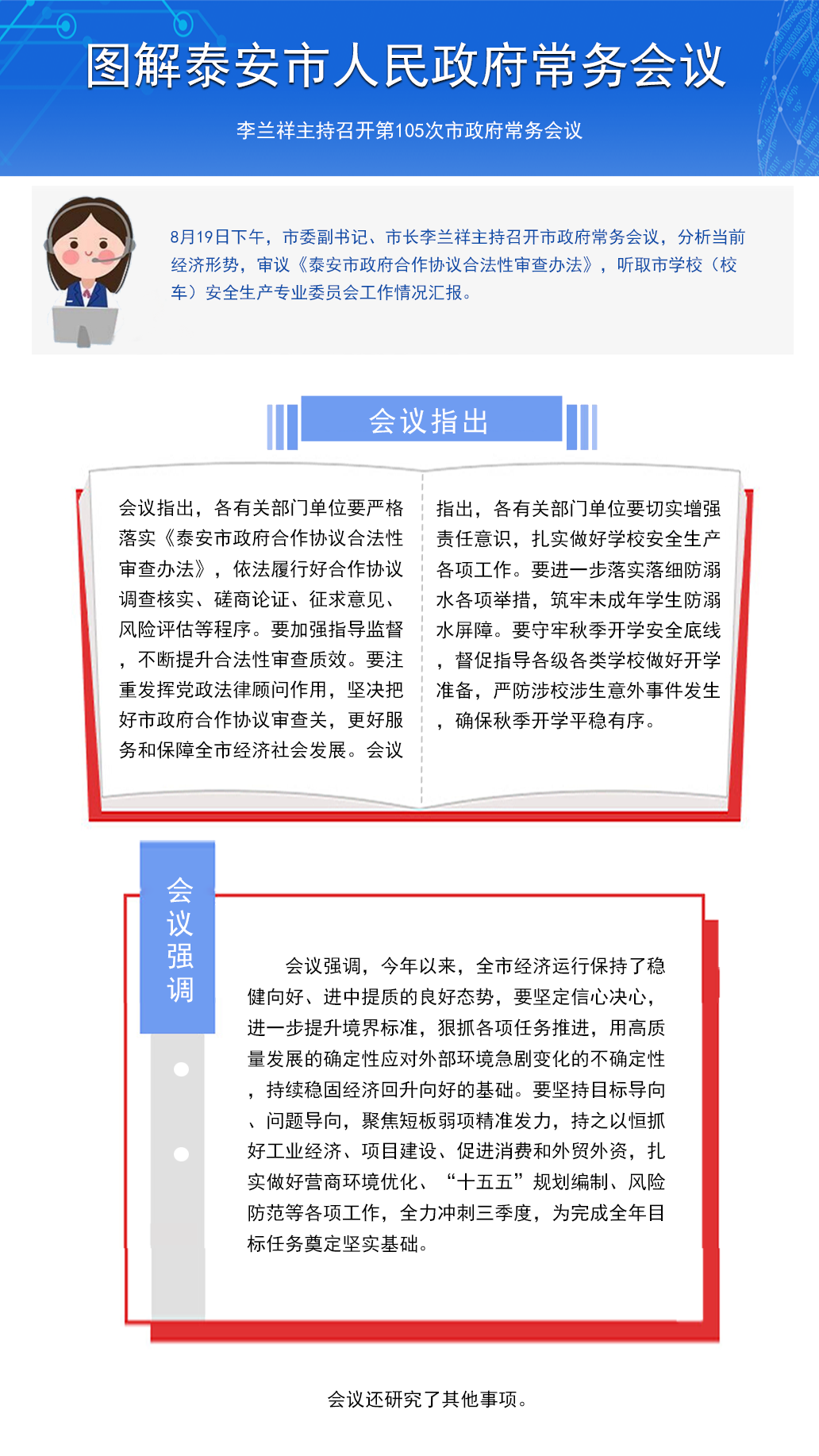 會(huì)議議題:分析當(dāng)前經(jīng)濟(jì)形勢(shì),審議《泰安市政府合作協(xié)議合法性審查辦法》,聽取市學(xué)校(校車)安全生產(chǎn)專業(yè)委員會(huì)工作情況匯報(bào)。
