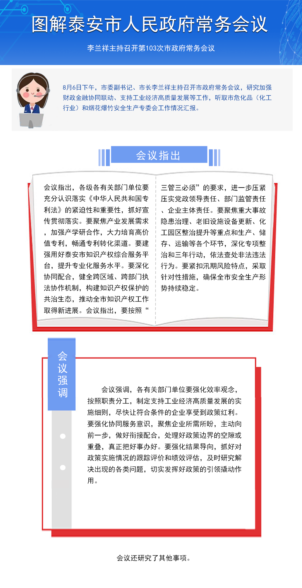 8月6日下午,市委副書記、市長李蘭祥主持召開市政府常務會議,研究加強財政金融協(xié)同聯(lián)動、支持工業(yè)經濟高質量發(fā)展等工作,聽取市危化品(化工行業(yè))和煙花爆竹安全生產專委會工作情況匯報。