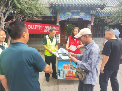 活動期間,志愿者們身著統(tǒng)一服裝,活躍在泰山紅門宮等景區(qū)景點,化身“文化使者”熱情地向游客發(fā)放文明旅游宣傳手冊。志愿者們耐心地向游客講解,引導(dǎo)大家文明參觀,愛護文物古跡,讓游客在欣賞古建筑之美的同時,增強文明旅游意識。