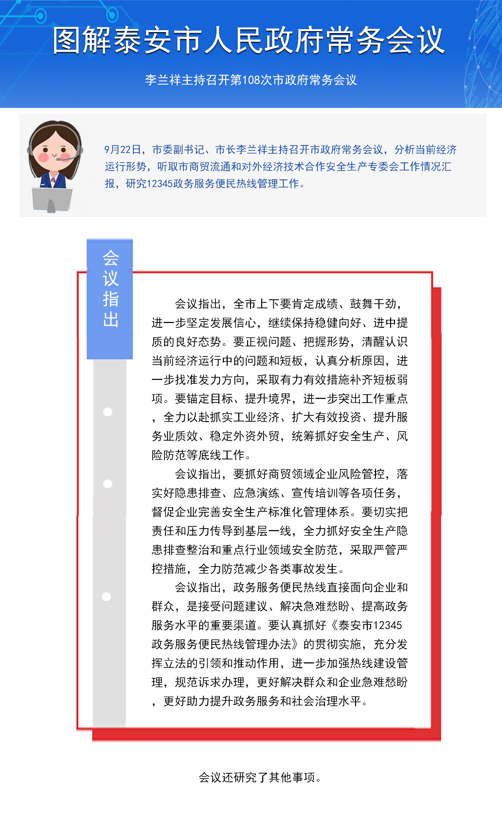9月22日,市委副書記、市長李蘭祥主持召開市政府常務(wù)會議,分析當前經(jīng)濟運行形勢,聽取市商貿(mào)流通和對外經(jīng)濟技術(shù)合作安全生產(chǎn)專委會工作情況匯報,研究12345政務(wù)服務(wù)便民熱線管理工作。